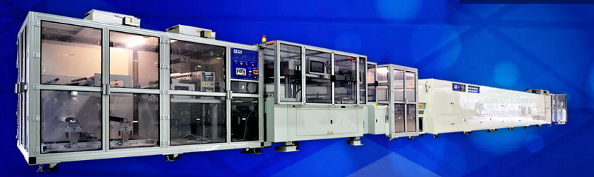 面板印刷過后由吸盤式機械臂吸取由精密滑軌移出臺面,到自動出料段放置在交叉式防靜電輪片上輸送到下一段烘干制程。